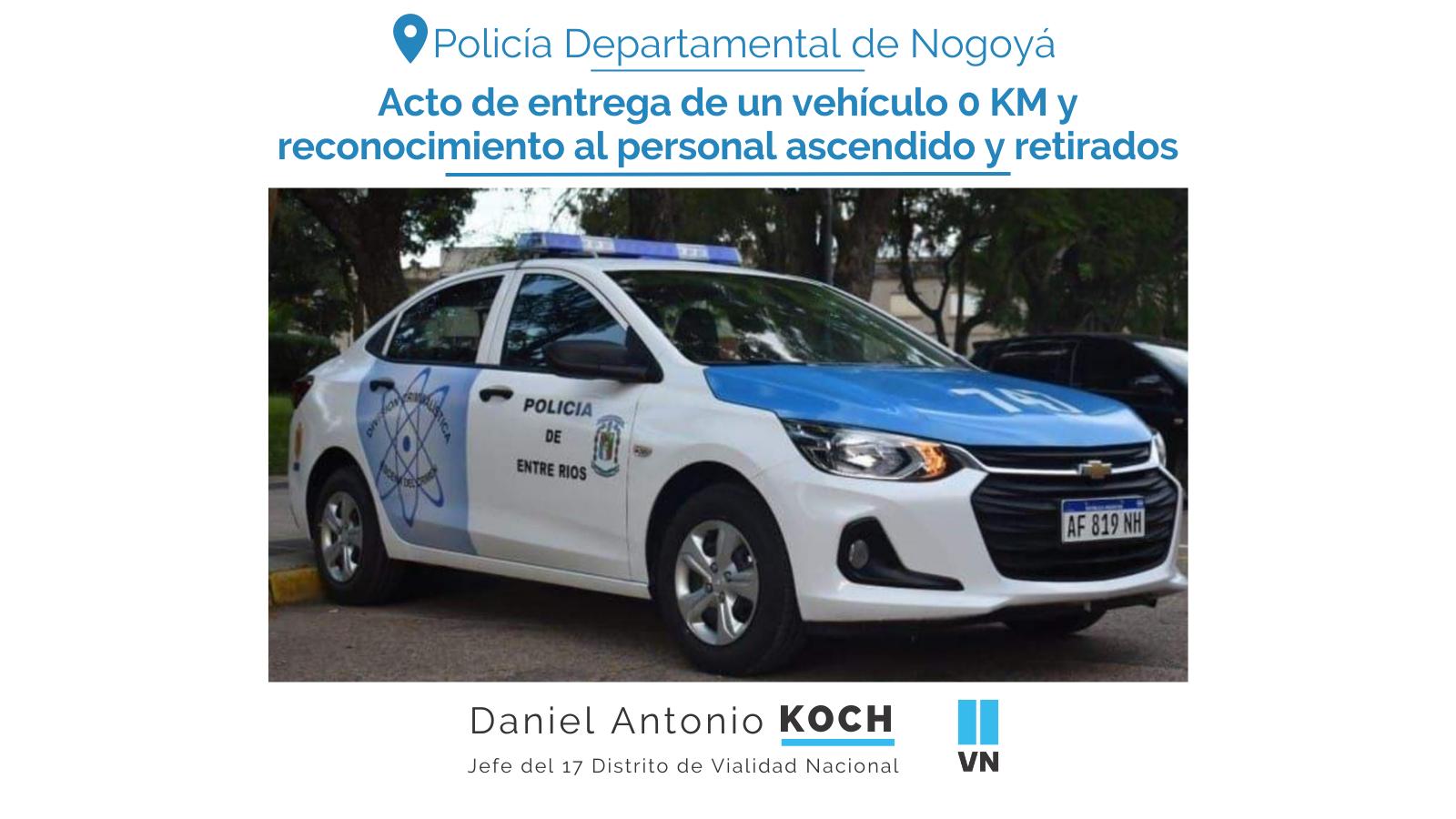 Este miércoles se desarrollará en Nogoyá el Acto de entrega de un nuevo vehículo (Chevrolet Onix 1.6) a la División Criminalística, Entrega de jerarquías a personal ascendido y el reconocimiento a funcionarios acogidos a retiro voluntario.