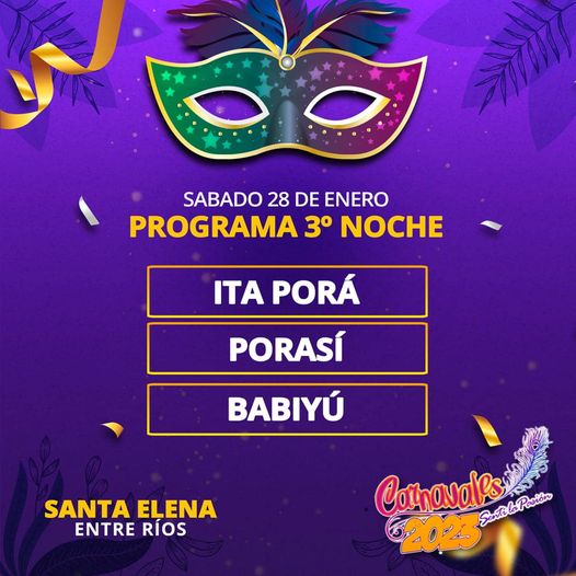 Compartimos con la comunidad local y turística el programa oficial para la segunda noche de carnaval en la ciudad de Santa Elena, Entre Ríos.